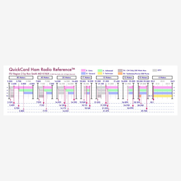 I realized that I needed this information in a large bookmark format with better visual scanning characteristics. I put all the bands from 160 meters down to 6 with clearly delineated frequency boundaries for Extra, Advanced, General, Technician, and Novice. While the FCC is not licensing new Advanced or Novice hams, I have included these for completeness. Further consolidation of the various types of transmissions are color or pattern coded for more clarity.